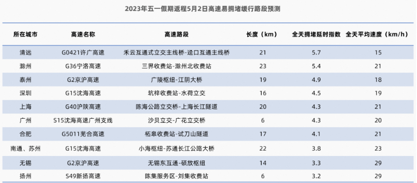 预计 2023 年 5 月 2 日(五一假期第四天)全国高速返程较易拥堵的路段主要是 G0421 许广高速清远段(禾云互通式立交主线桥-迳口互通主线桥),全天拥堵延时指数约为 5.7,全天平均速度约为 15km / h,其次是 G36 宁洛高速滁州段(三界收费站-滁州北收费站)以及 G2 京沪高速泰州段(广陵枢纽-江阴大桥)。