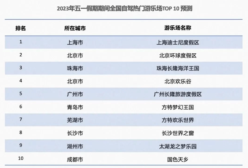 预计 2023 年五一期间,全国自驾热门游乐场将包含上海迪士尼度假区、北京环球度假区、珠海长隆海洋王国、北京欢乐谷、广州长隆旅游度假区等。