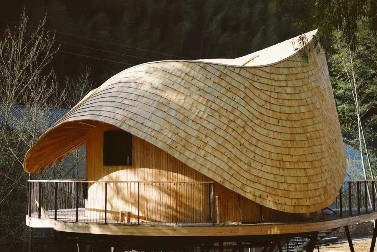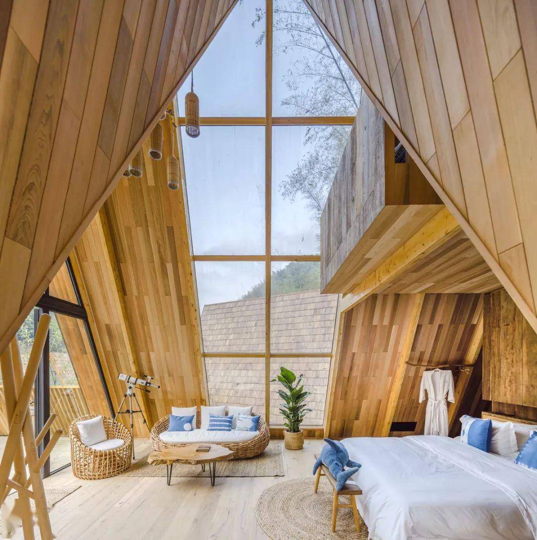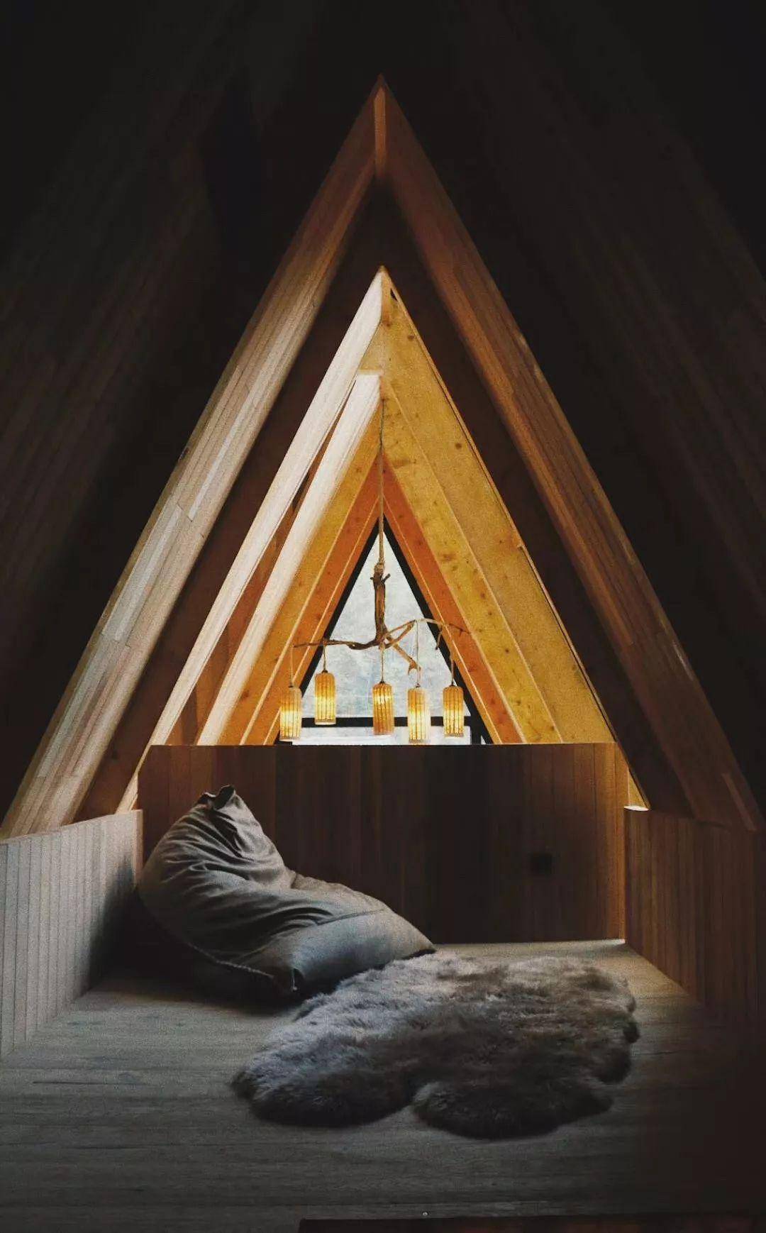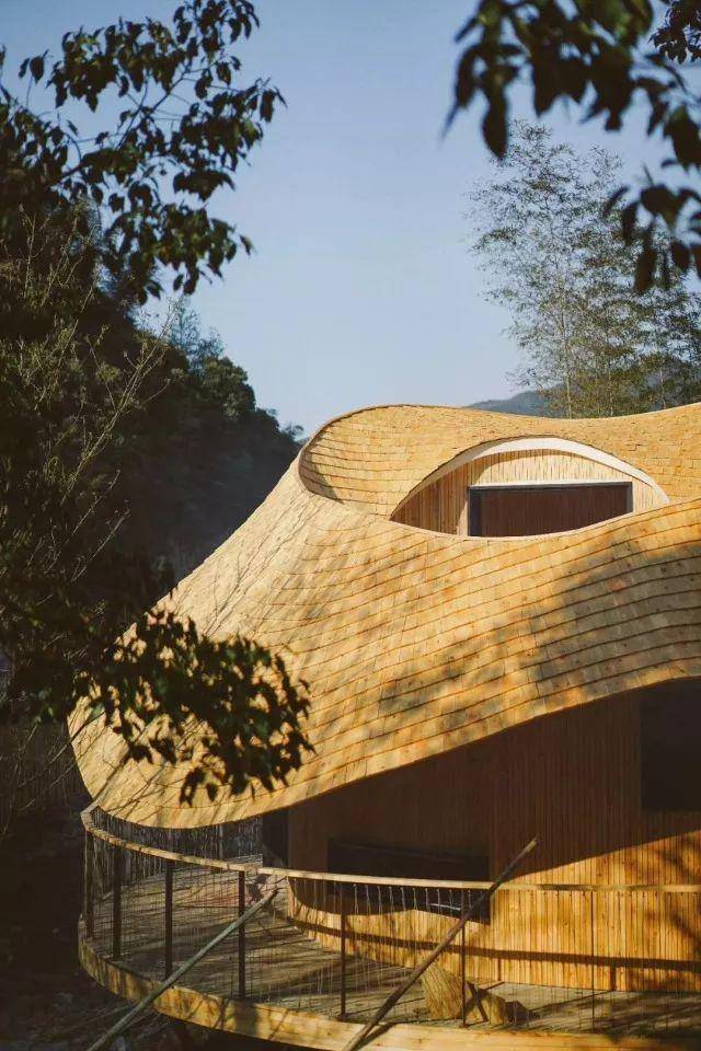 建筑的弧顶形态流畅,大老远就很引人注目。靠近细看,每一块木头的形状都是独一无二的。同时设计师根据人的动线和视线,开启了多个视觉窗户,使得在鸟巢loft中站、坐、卧、仰,可以欣赏到周遭的不同风光。
