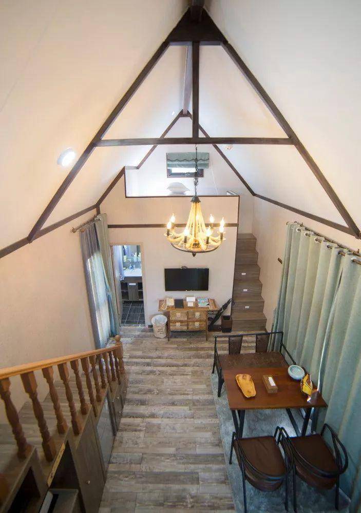 沿着阶梯上到一层,一进门就是舒适的双人床和超大的落地玻璃窗,窗口望出去一片绿意盈盈。室内摆放的都是纯天然原木家具和手工粗陶餐具,配有地暖、空调、迷你冰箱、蓝牙音箱等设备,堪称自然与现代相结合的典范。
