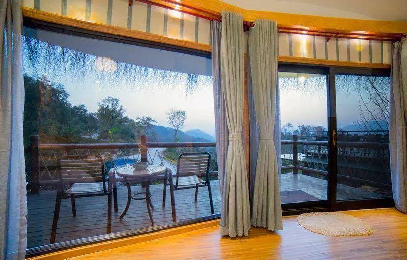 在客房的入口处是一处落地玻璃围合成的建筑,用来作为餐厅,坐在里面也能感觉身心已经融在这山水间了。