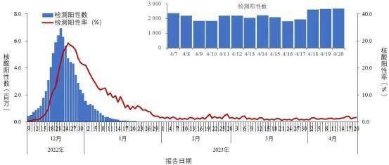 全国报告人群新型冠状病毒核酸检测阳性数及阳性率变化趋势(数据来源于31个省(区、市)及新疆生产建设兵团报告)
