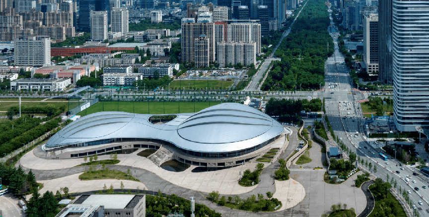 作为十四运会闭幕式备选场馆以及排球(女子成人组)项目、击剑项目比赛场馆,陕西奥体中心体育馆如同洁白的贝壳镶嵌在西安高新区的超高层建筑群之间。