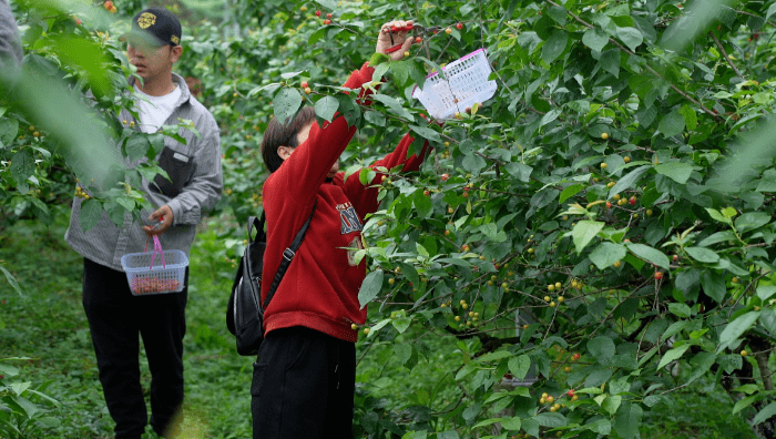 一边采摘品尝,一边拍照打卡,游客们沉醉于樱桃园,尽享春日乐趣。今年,江山如画公司种植樱桃面积50多亩。自樱桃上市以来,迎来一拨又一拨的采摘游客。“晚熟品种的采摘期要到5月10日左右,这段时间每天有上百名游客前来采摘,碰上周末两天,日均采摘人数超千人。”江山如画公司生产部副总经理张志福面露悦色地说。