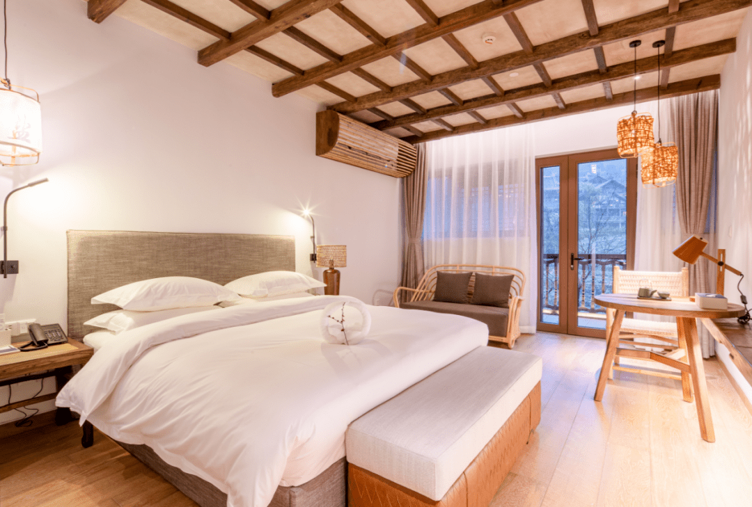楼阁间,廊桥上,不时停下来吹吹风,在翠色渐明的山里,栖息在野,享受寨里慢时光。