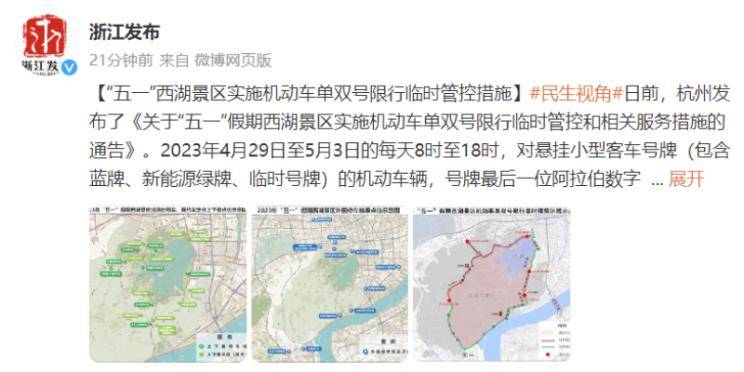 原标题:杭州:五一假期西湖景区实施机动车单双号限行临时管控措施