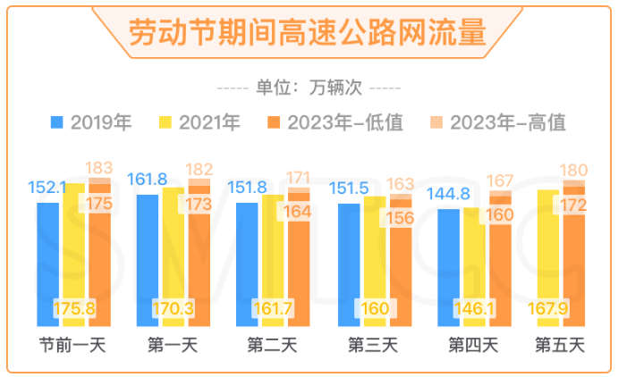 根据该中心预测分析,高速公路车流规模将达到825至865万辆次,日均流量约165至173万辆次,与2021年同期相比增幅在2%至7%之间,较2019年同期增长8%至14%。