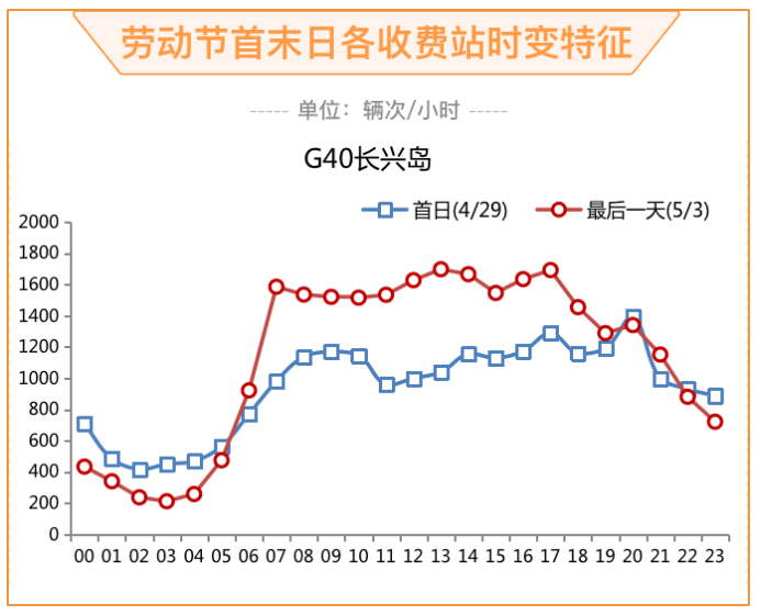 节假日常态性拥堵区域G40长江隧道,预计劳动节期间日均流量为10.8万辆次/日,较2021年同期增长约5%。其中上行(江苏方向)5.2万辆次,下行(市区方向)5.6万辆次。流量最大时段为8时至11时,平均小时流量达6400辆次,次高峰为13时至15时,平均小时流量达6000辆次。