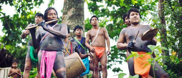 1小时后,我们终于来到了这个非常隐蔽的土著人部落。当我们登岸时,一个近乎全果的村民欢迎队已经在码头等候我们了,一边用他们的原始乐器吹吹打打,一边热情地把我们迎进了他们的村子。