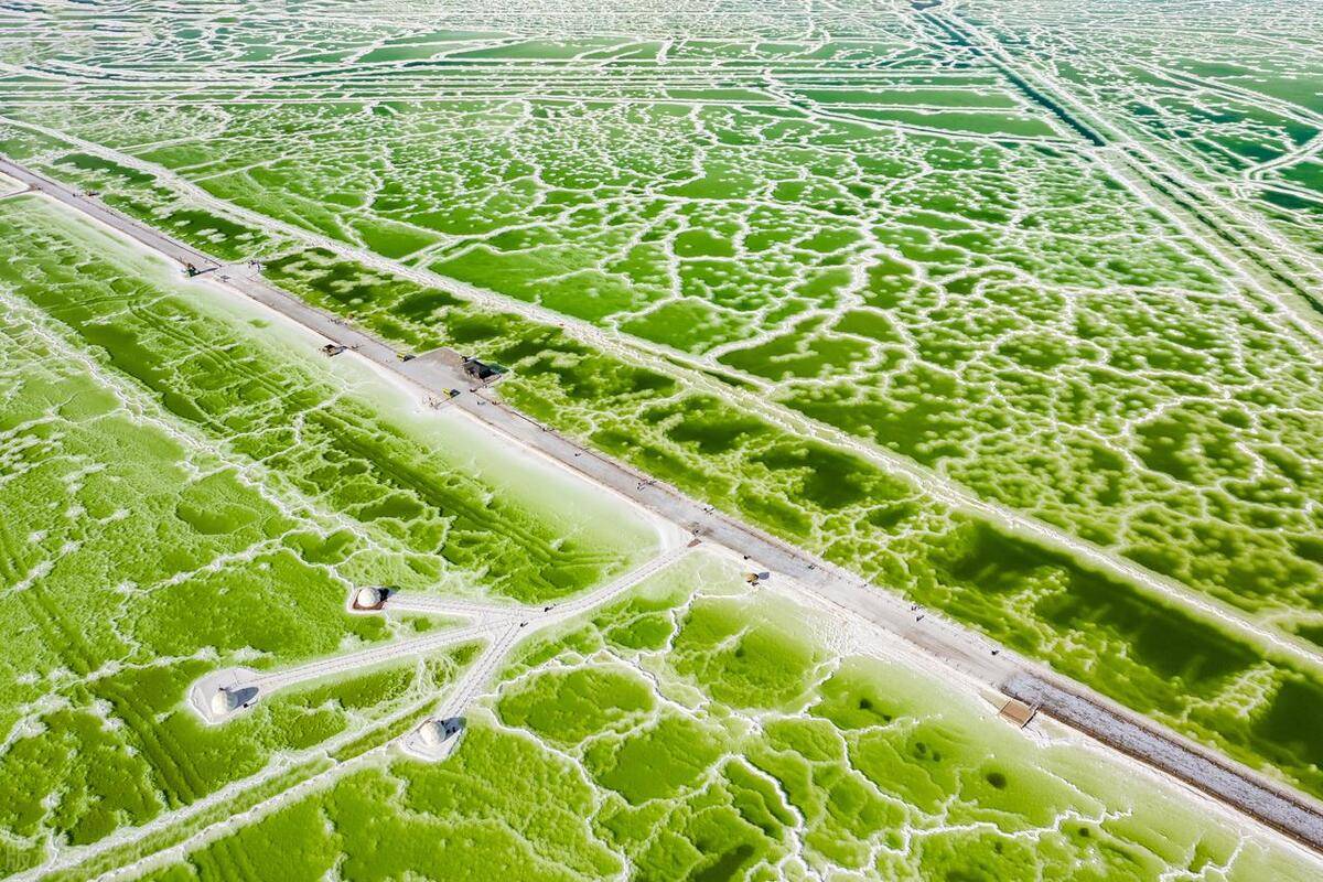 浅蓝色和黄绿色的湖水相呼应,整个湖底洁白的盐晶一直延伸到岸边,周围的景物、天空和白云都倒映在湖中。