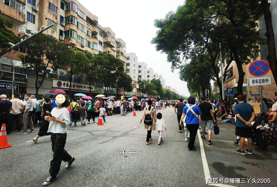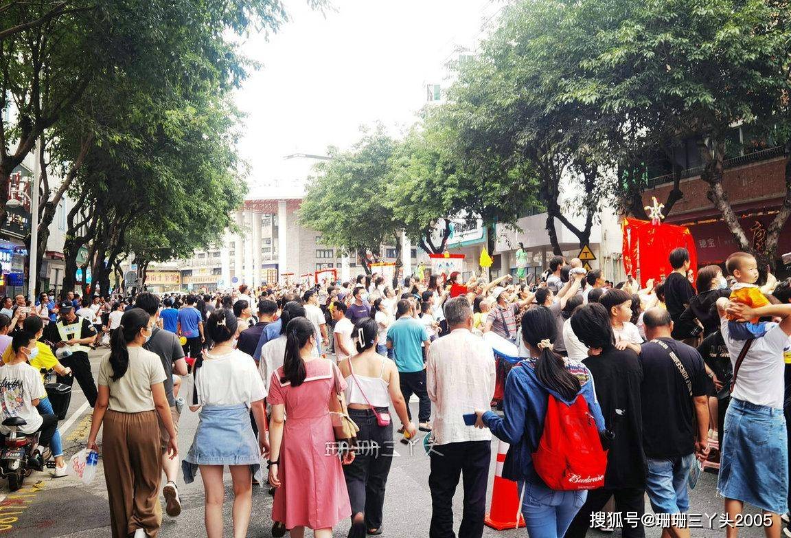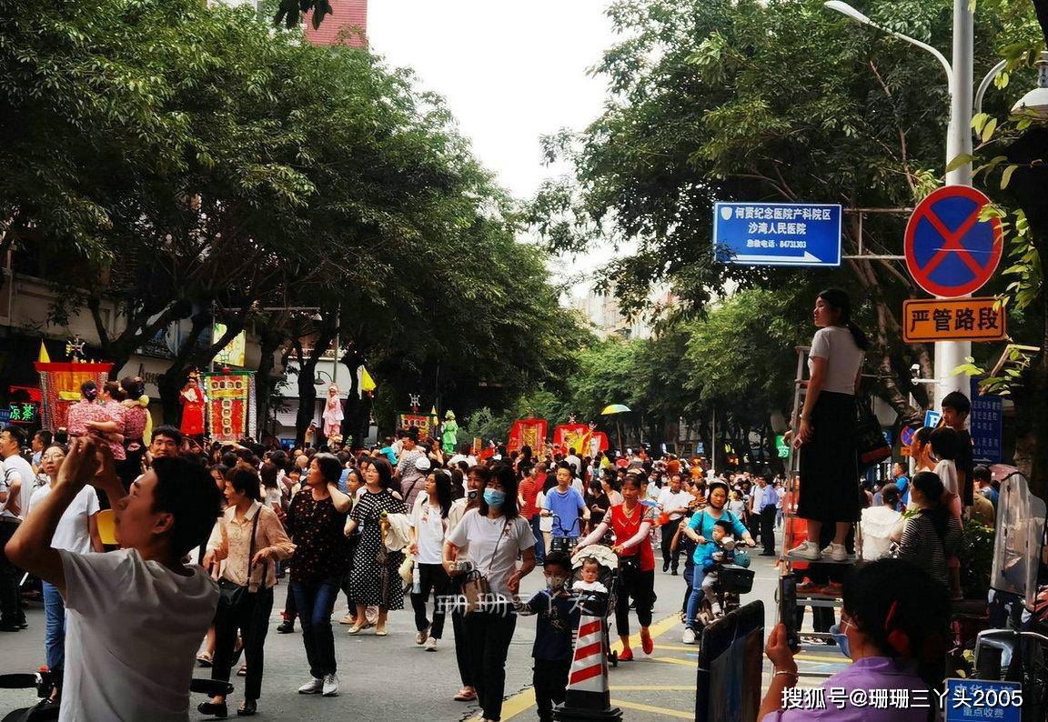 下车后,珊珊三丫头准备从沙湾大道往沙湾古镇方向走,沿路见到工作人员正在封路,许多人在沿路的围栏边上靠,应该是希望能占个“头位”,以便能清晰看到巡游队伍……我跟工作人员打听了一下,原来今年的沙湾飘色巡游,会在沙湾古镇沿线举行,其中主会场设在沙湾古镇内,而巡游队伍会途经沙湾大道、中华大道等主干道,让更多的市民在更开阔的场地感受到沙湾的飘色。我在向前走的过程中,看到聚集的人越来越多,也不敢向前走了,在一个人比较少的地方停了下来,也占了一个“头位”,静等飘色的游行队伍走过来。