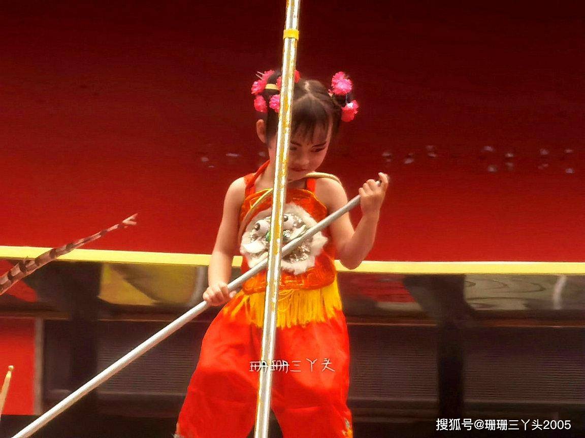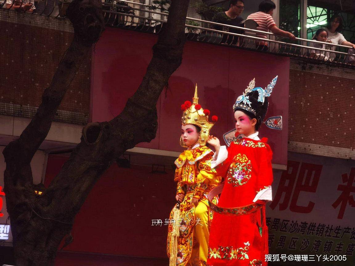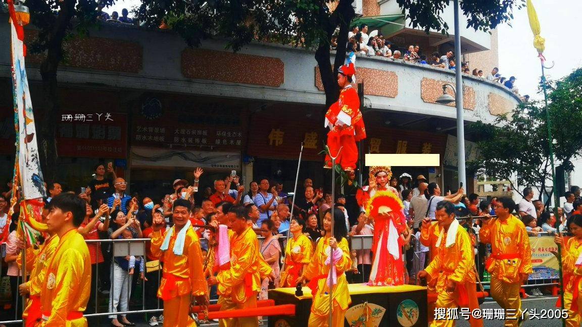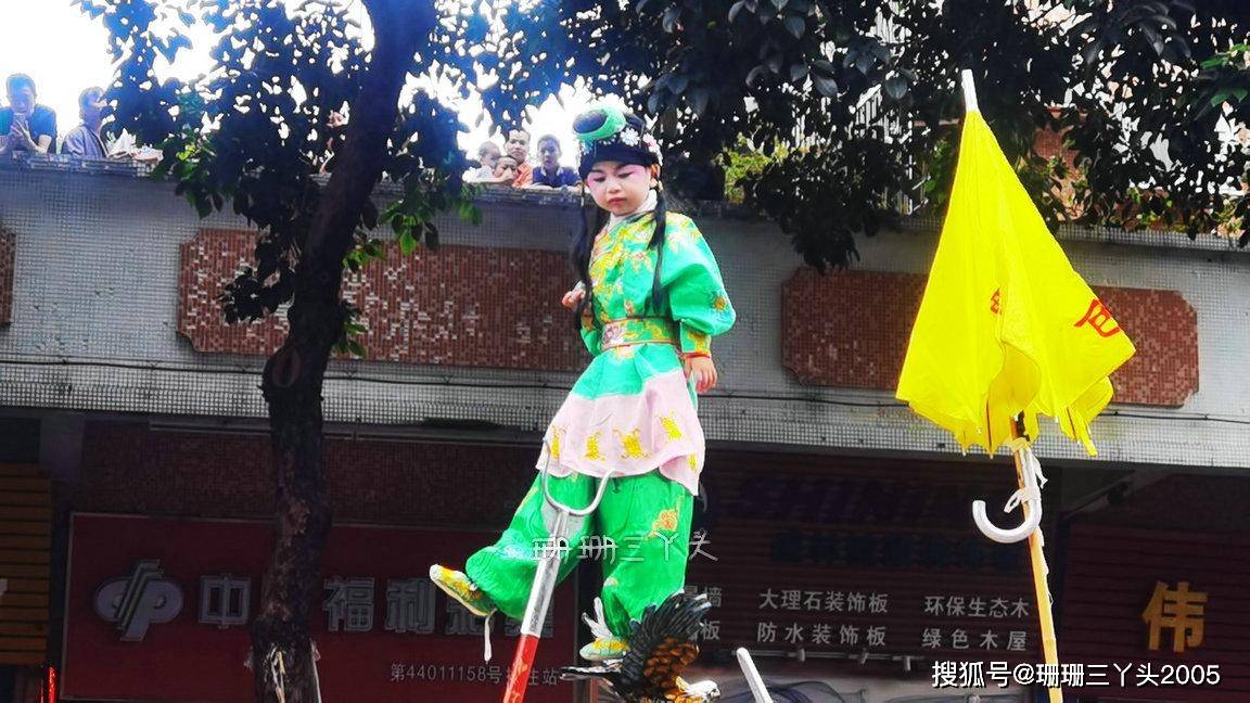 珊珊三丫头清晰地记得第一次看“飘色”时,就忍不住发了多声“哗哗哗……”,因为看到一个年龄很小的小朋友,化了“古戏剧”妆容,穿着古装“飘”在了半空之中,当时就好奇:小朋友这么小,被飘在半空不害怕吗?是怎么飘上去的?