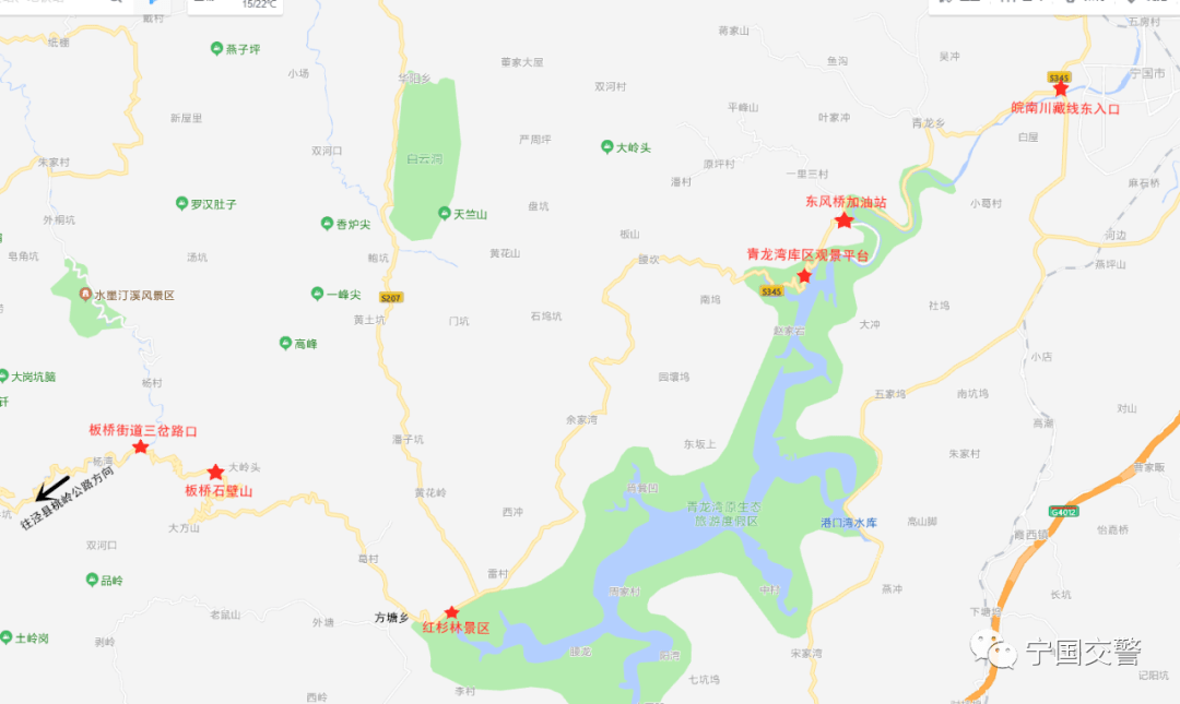4、皖南川藏线:西津野渡路段、东风桥加油站、青龙湾库区观景平台、红杉林景点、板桥石壁山、板桥街道。