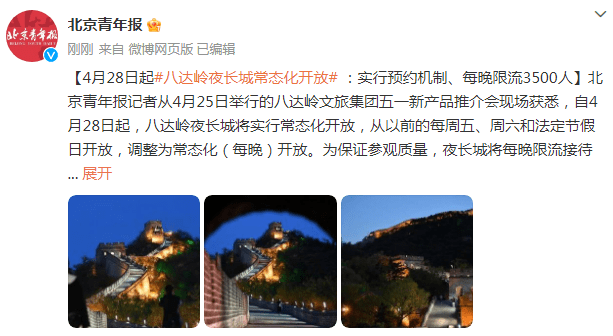 北京青年报记者从4月25日举行的八达岭文旅集团五一新产品推介会现场获悉,自4月28日起,八达岭夜长城将实行常态化开放,从以前的每周五、周六和法定节假日开放,调整为常态化(每晚)开放。为保证参观质量,夜长城将每晚限流接待3500人,并实行预约机制,市民和游客可以通过“长城内外”小程序等方式提前预约。