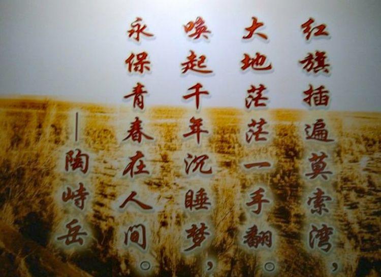 听讲解员介绍说,由于当时没有房屋,我们的军垦战士就掘地为穴,建起“地窝子”;没有工具,就自己锻造砍士曼,镰刀;没有水,就迈开双脚,踏遍群山寻水源,开渠引水到荒原;缺乏畜力,就人拉肩扛;没有绳索,就用芨芨草搓成套绳,搭在肩上8个人拉一张犁。当时,从王震将军到师团长都以身作则,带头参加劳动,鼓舞了战士们的劳动热情,沉睡千年的处女地上第一次荡漾着军垦战士愉快嘹亮的劳动歌声:“八人拉犁气死牛,芨芨草搓绳不发愁。不怕苦、不怕难,戈壁滩上盖花园。” 正是: