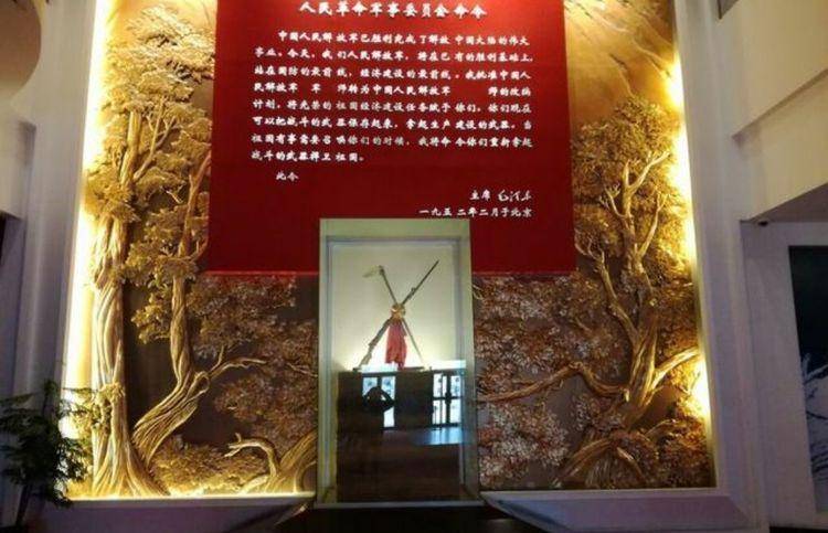 毛泽东主席一九五二年二月签署的《人民革命军事委员会命令》在雪山、胡杨木刻浮雕背景衬托下庄严醒目,下方象征“战斗的武器”的步枪和象征“生产建设的武器”的“坎土曼”相倚,无言肃一段因为站天斗地而感天动地的历史仿佛在此定格,继而徐徐展开……