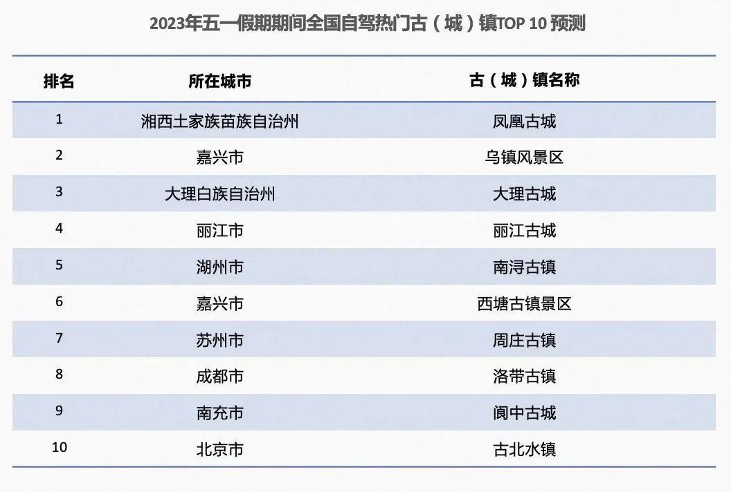 预计2023年五一期间,全国自驾热门古城(镇)将包含凤凰古城、乌镇风景区、大理古城、丽江古城、南浔古镇等。报告提醒公众自驾前往景区时尽量提前做好停车规划,可以考虑将车停泊在较远的停车场,步行前往;或是打车、乘坐公共交通出行。