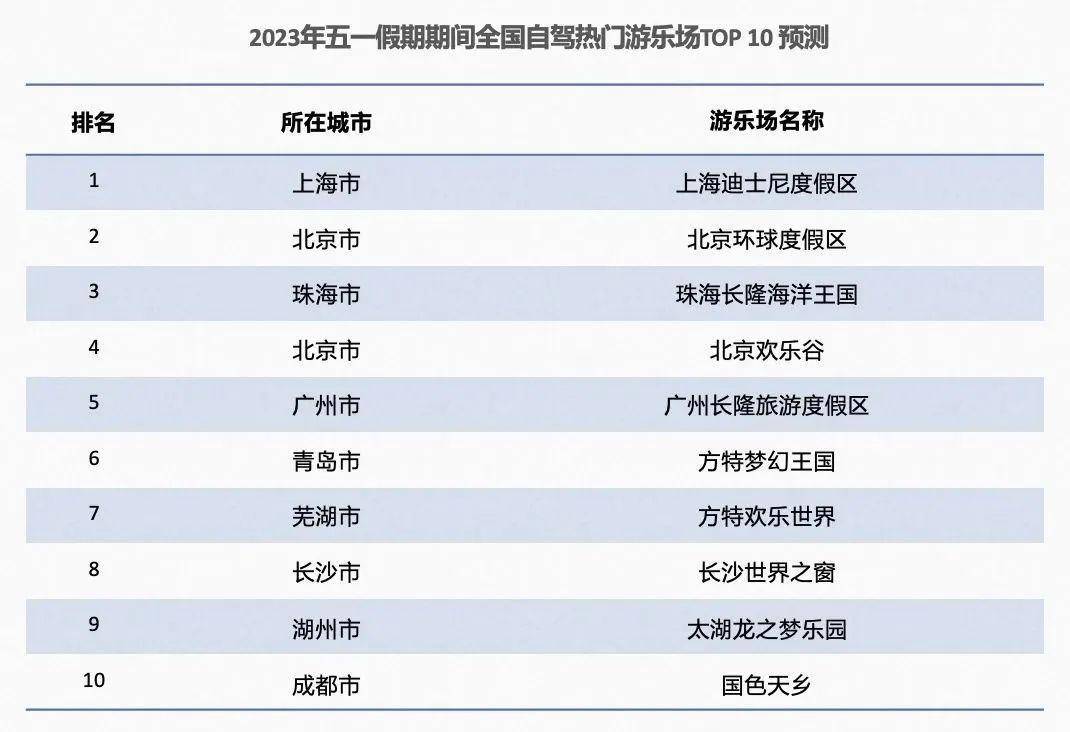 预计2023年五一期间,全国自驾热门游乐场将包含上海迪士尼度假区、北京环球度假区、珠海长隆海洋王国、北京欢乐谷、广州长隆旅游度假区等。提醒公众自驾前往时,注意路面交通安全,遇到拥堵请耐心排队。
