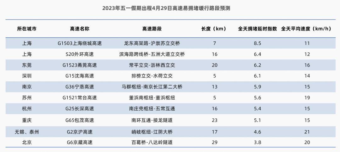 预计2023年4月29日(五一假期首日)全国高速出程较易拥堵的路段主要是G1503上海绕城高速(龙东高架路-沪崇苏立交桥),全天拥堵延时指数约为8.5,全天平均速度约为11km/h,其次是上海S20外环高速(滨海路跨线桥-五洲大道立交桥)以及G1523甬莞高速(常平立交-沥林西立交),预计拥堵高速主要分布在长三角、珠三角、成渝地区,以及北京、郑州、西安、昆明、长沙、武汉等城市周边。
