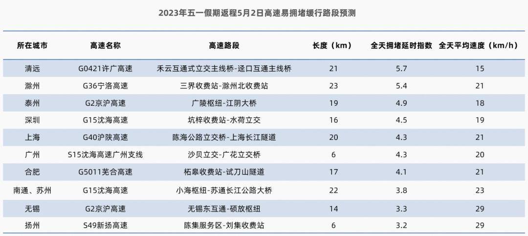预计2023年5月2日(五一假期第四天)全国高速返程较易拥堵的路段主要是G0421许广高速清远段(禾云互通式立交主线桥-迳口互通主线桥),全天拥堵延时指数约为5.7,全天平均速度约为15km/h,其次是G36宁洛高速滁州段(三界收费站-滁州北收费站)以及G2京沪高速泰州段(广陵枢纽-江阴大桥),预计以下高速路段会有不同程度拥堵,建议途经的车主时刻注意路况,合理避堵。