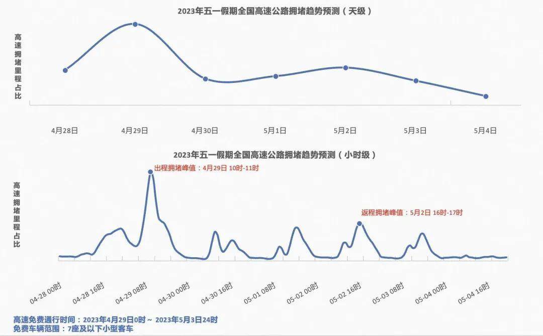 受五一高速免费通行、气温较为适宜等多重因素影响,预计2023年4月29日(假期首日)为高速出程高峰,9时-12时是出程高峰时段,峰值出现在10时-11时;5月2日(假期第四天)15时-19时为返程高峰,峰值出现在16时-17时,预计出程整体交通压力高于返程,高速返程较为分散。