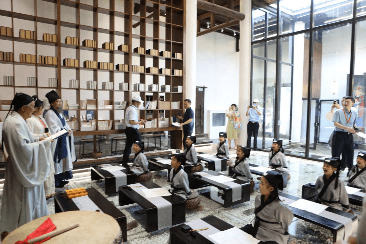 村口的“钓源欧阳氏祠”,为清朝建筑风格,坐南面北,分为总祠、房祠、家祠,祠堂东面是“崇文书院”。前后厅的天井形成了大大的“品”字,钓源古村自古就把“讲究品德,注重品行,追求品位”作为立身之本。与欧阳氏宗祠远远相望的,是“八老爷别墅”,别墅的前院后庭气势宏伟,桂花四季飘香,对联上写着:“神驰万里观天地,笔写千章说古今。”如今的别墅已成为村史馆。展馆内,四库全书馆总裁曹秀先的青花瓷联“一榻清风书叶舞,半窗明月墨花香”,明代祝枝山手书的楹联“灯火夜深书有味,墨花晨湛字生光”,彰显着先贤们勤于修学的品格。千百年前,欧阳修的母亲画荻教子,以沙地做纸,以芦苇做笔,培养出了一个中国文坛的领袖。欧阳修身居高位,惟贤是举,王安石、司马光、包拯、苏轼,都得益于他的培养、推举,在欧阳修的带领下,开创了一代文坛新风。钓源人沿袭了欧阳修的处世之道,在生活中谨守做人做事的道德准则,在他们看来,考取功名的目的,不仅是为了功名利禄,也是获得报效国家和造福百姓的机会。