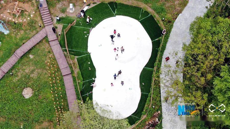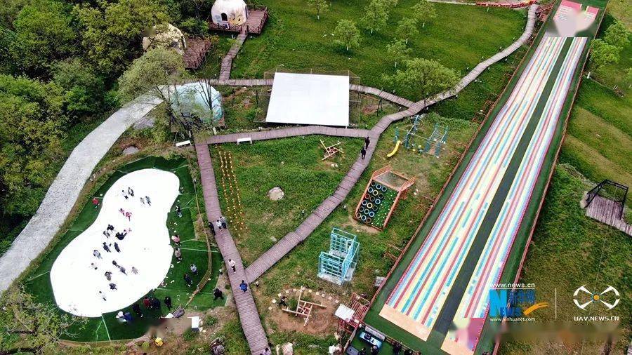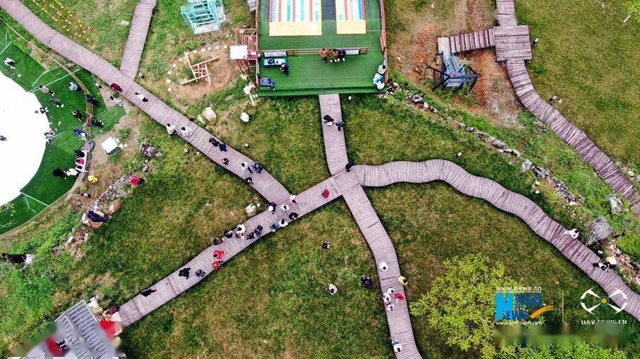 4月22日,游客在甘肃省陇南市两当县云屏镇乡野拾光体验园游玩,欣赏田园春色。(无人机照片)新华网发 (刘辉 摄)