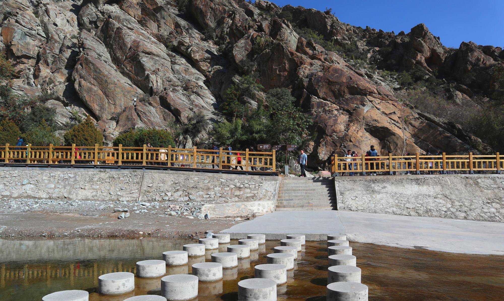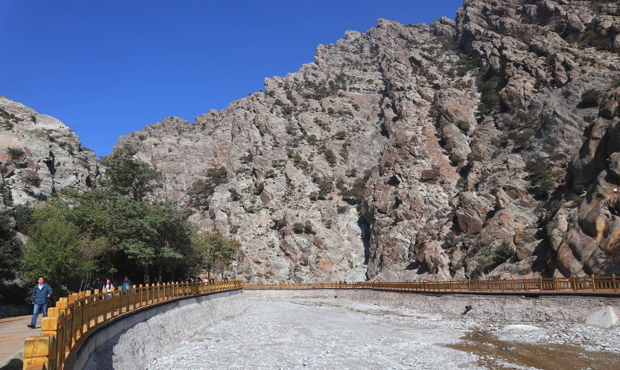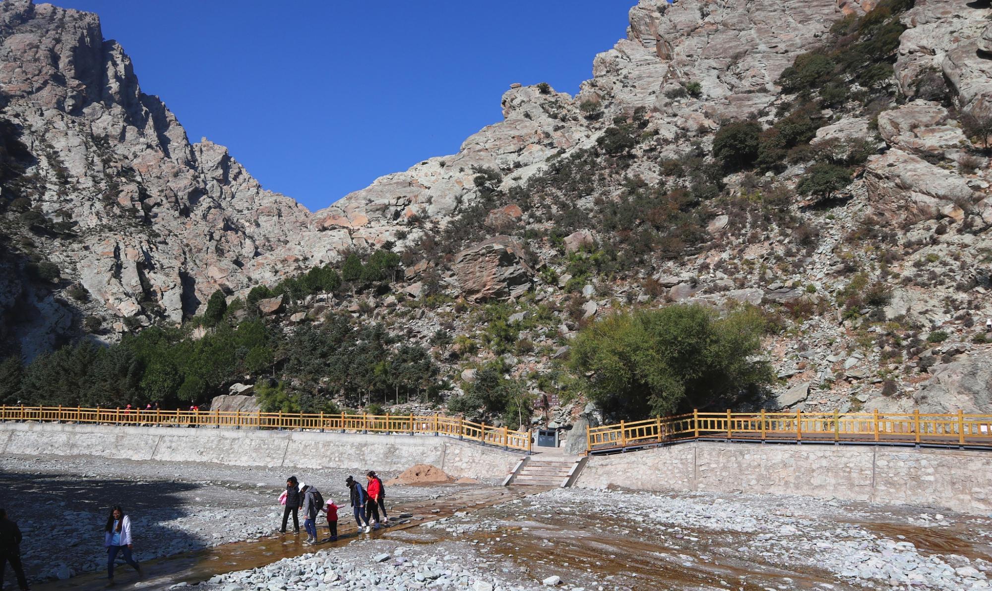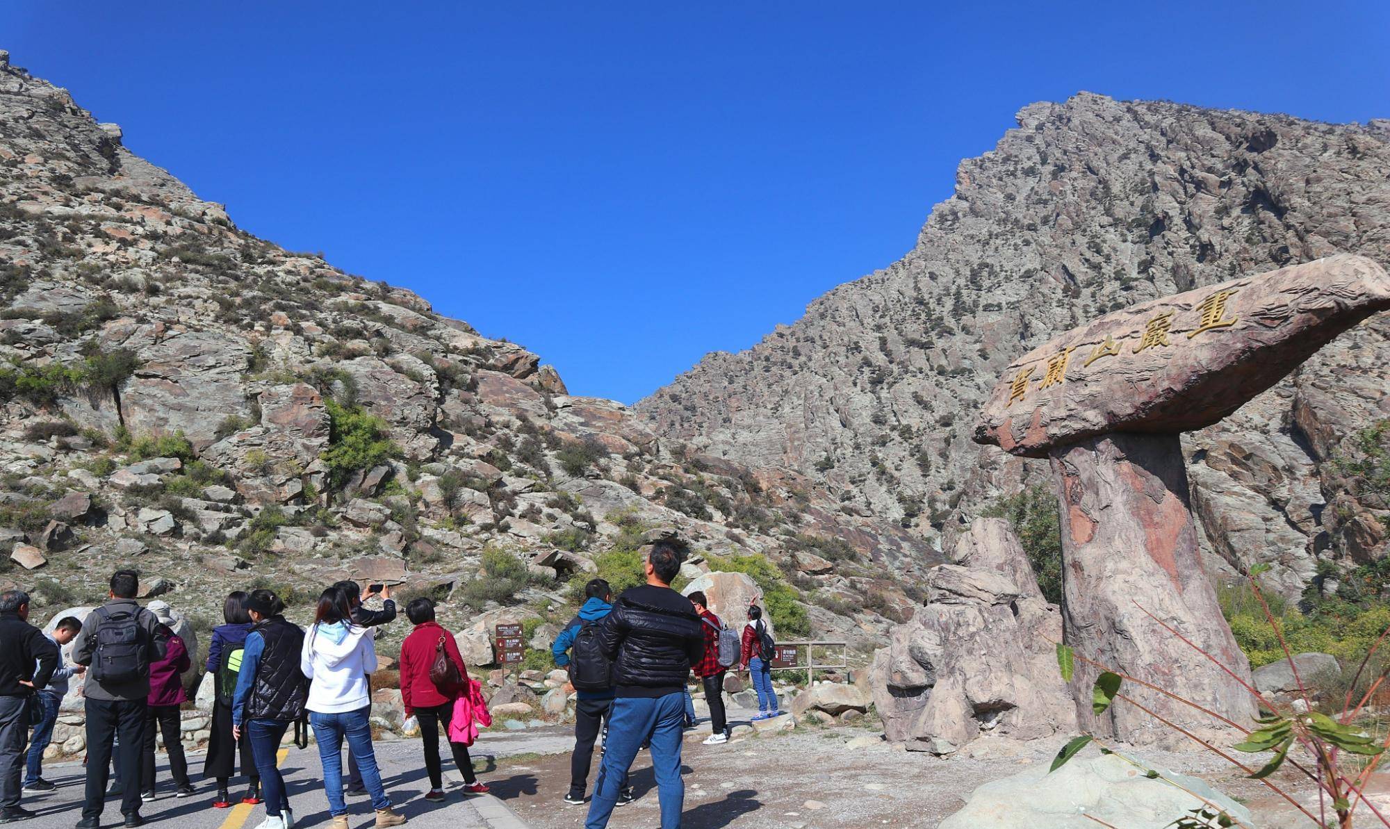 游客要走过贺兰山泉到对岸,逆时针参观一周。贺兰口距银川城50余公里,山势高峻,海拔1448米,俗称“豁了口”。山口景色幽雅,奇峰叠障,潺潺泉水从沟内流出,约有千余幅个体图形的岩画,分布在沟谷两侧绵延600多米的山岩石壁上。