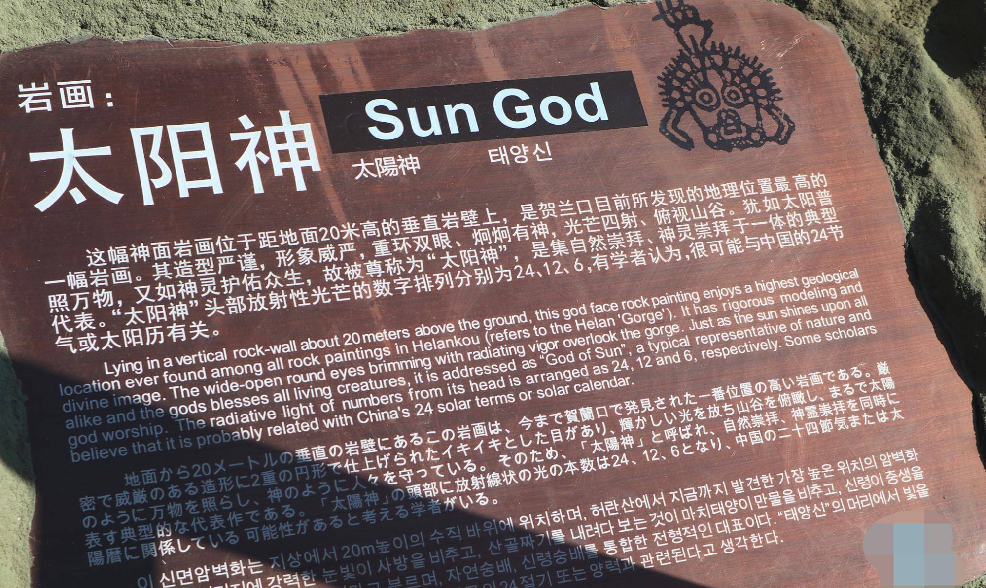 在一处向阳的山坡处,距地面大约10米高处,有一处插着红旗的岩画所在,这里便是贺兰山岩画的代表作“太阳神”了。这幅岩画采用拟人的手法把太阳神创作成一幅可爱的人物肖像,手法熟练,技艺纯熟,令人叹为观止。