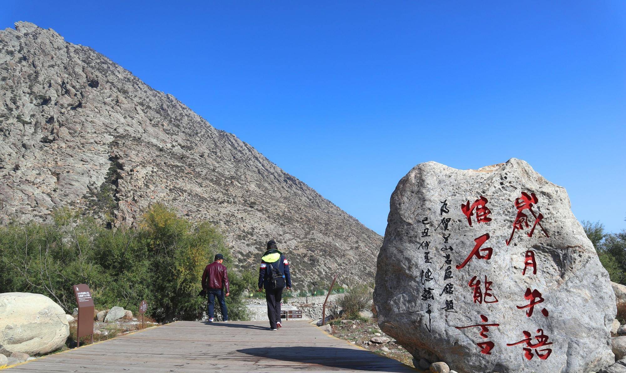 从景区岩画博物馆坐电瓶车直达岩画区。这块写着“岁月失语,惟石能言”八个大字的巨石,为2009年6月著名作家、中国文联副主席冯骥才先生参观贺兰山岩画景区后所题赠。