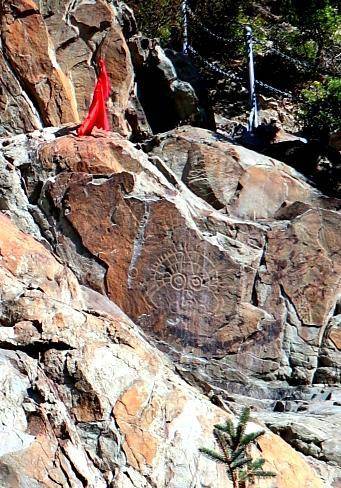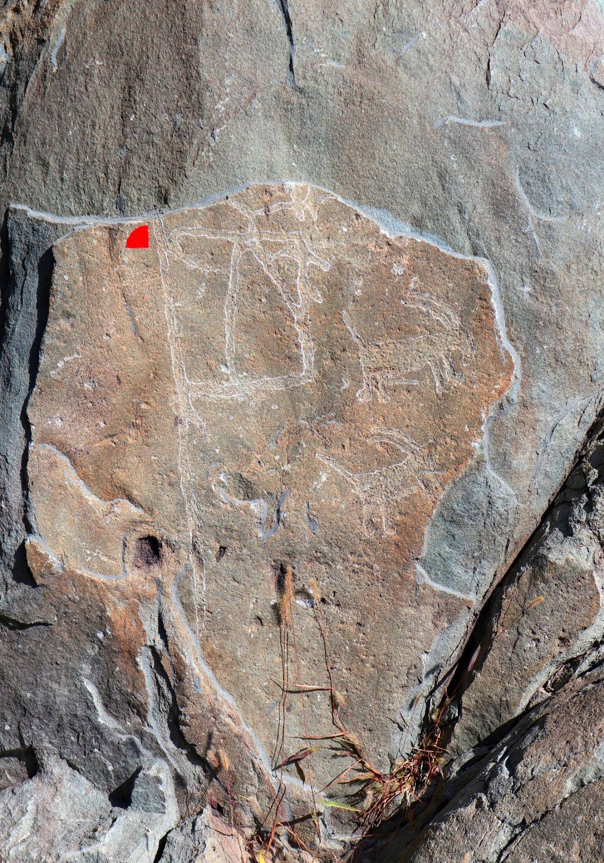 岩画比我们之前想象的要小了很多,都不太醒目。所以,景区工作人员会很贴心地做一下标记,这里插了一面小红旗或者是红色鲜艳的小贴纸,让游客很容易会找到。在景区里,似乎插小红旗的,仅此一处,也显示出“太阳神”的卓尔不凡。