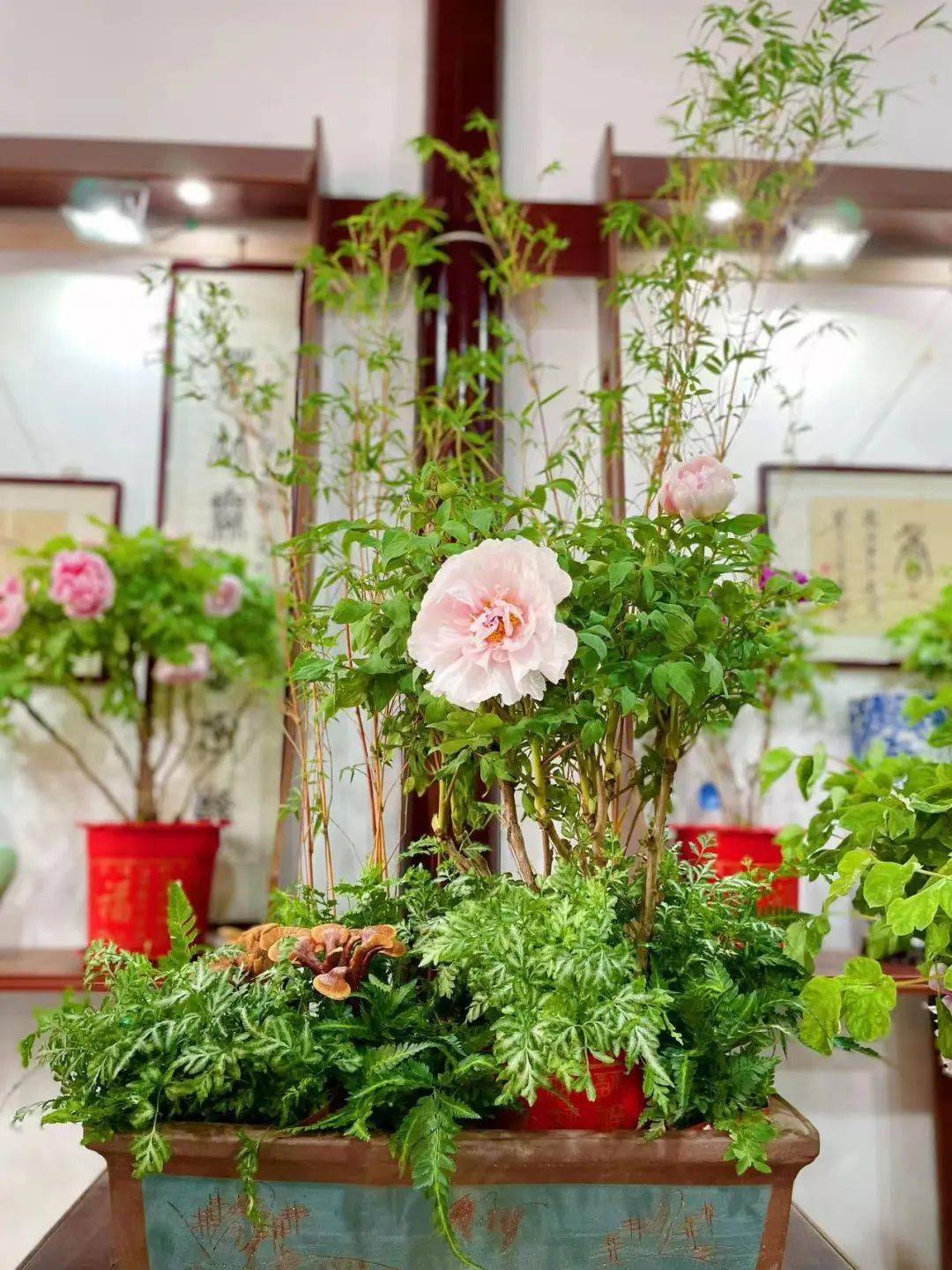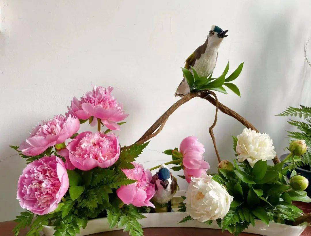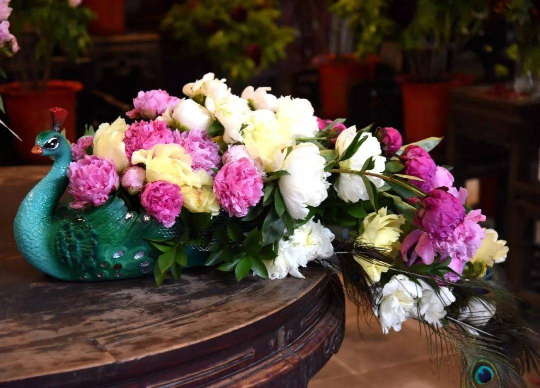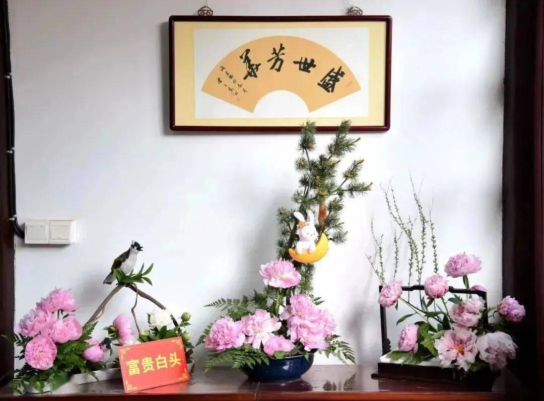 以“国泰民安”“花开富贵”为主题的牡丹艺术插花,通过不同色彩搭配和造型设计,淋漓尽致地展现牡丹色泽缤纷、姿态雍容的“颜值”和大气高贵的“气质”。