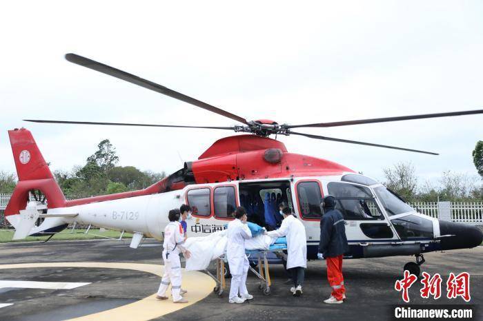 救援直升机转运患病的游客。 涠洲岛旅游区管委会供图