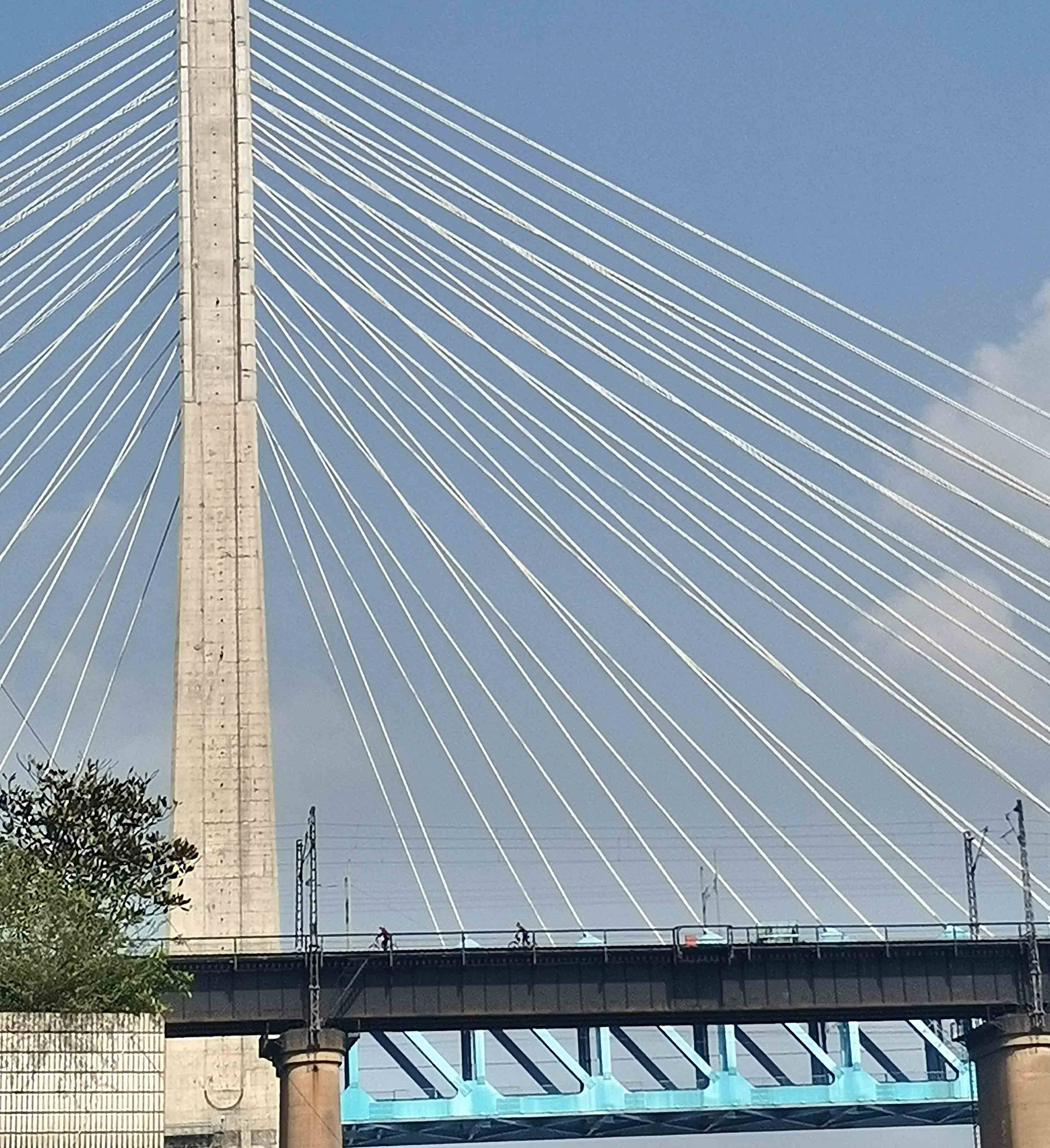 大胆的骑士在大桥上骑行,好似穿行在钢索之中