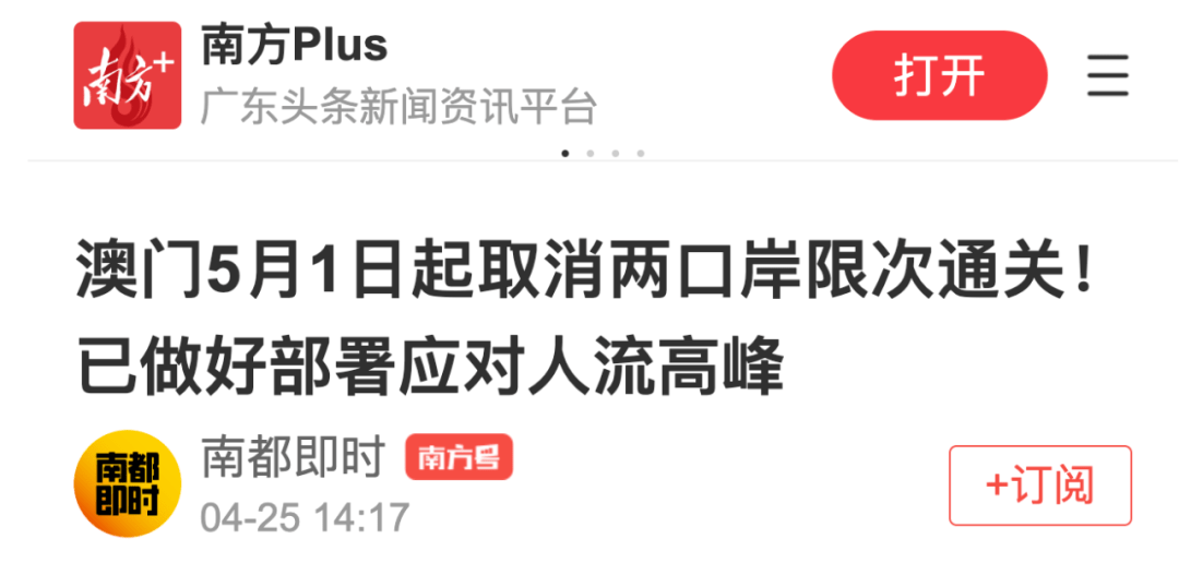 据媒体报道,4月25日,澳门海关关长黄文忠表示,5月1日凌晨零时起,关闸口岸、青茂口岸不再实施限次通关,预计人流会增加,现已做好部署,海关会联同治安警应对内地黄金周人流高峰。