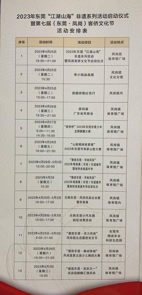 本次活动期间,凤岗镇将以“客侨传薪火 文化起宏图”为主题,在8天节庆中,将陆续上演11项主打活动。除了举办广东省民歌会、客家山歌大赛、青少年龙狮麒麟大赛、粤港澳(东莞)非遗墟市外,还将举办融合莞邑文化、红色文化的客侨情韵油画展和莞籍侨胞红色行,充满潮流范的美食嘉年华、生态露营音乐节,以及乐购东莞·凤岗优品展、汽车展等精彩活动。
