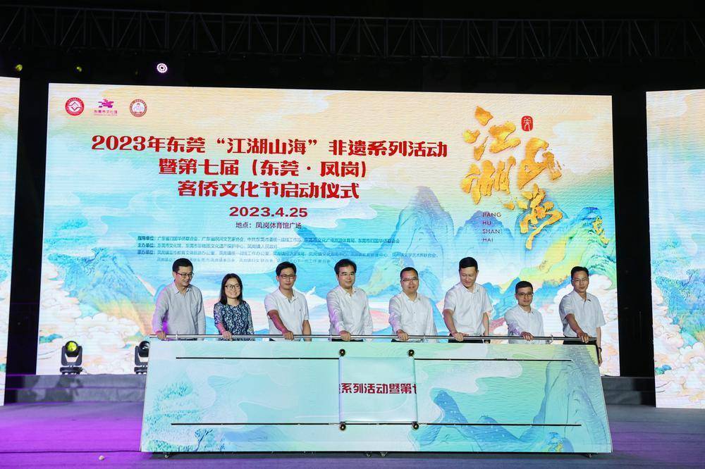 暮春之夜,莞邑“侨乡”,满城璀璨。4月25日晚上,2023年东莞“江湖山海”非遗系列活动暨第七届(东莞·凤岗)客侨文化节在凤岗镇体育馆广场盛大启动。活动由东莞市文化馆、东莞市非物质文化遗产保护中心、凤岗镇人民政府主办,自4月25日持续举办至5月3日。2023年“江湖山海”非遗系列活动联动全市33个镇街园区,开展基础类、文化类、审美类非遗活动将近200项。为期8天的客侨文化节,将陆续上演11项精彩纷呈的活动,满足人民群众精神文化需求,打造“五一”期间莞深市民文旅消费新场景、新热点,为文化强市、文化强镇建设注入新动力。