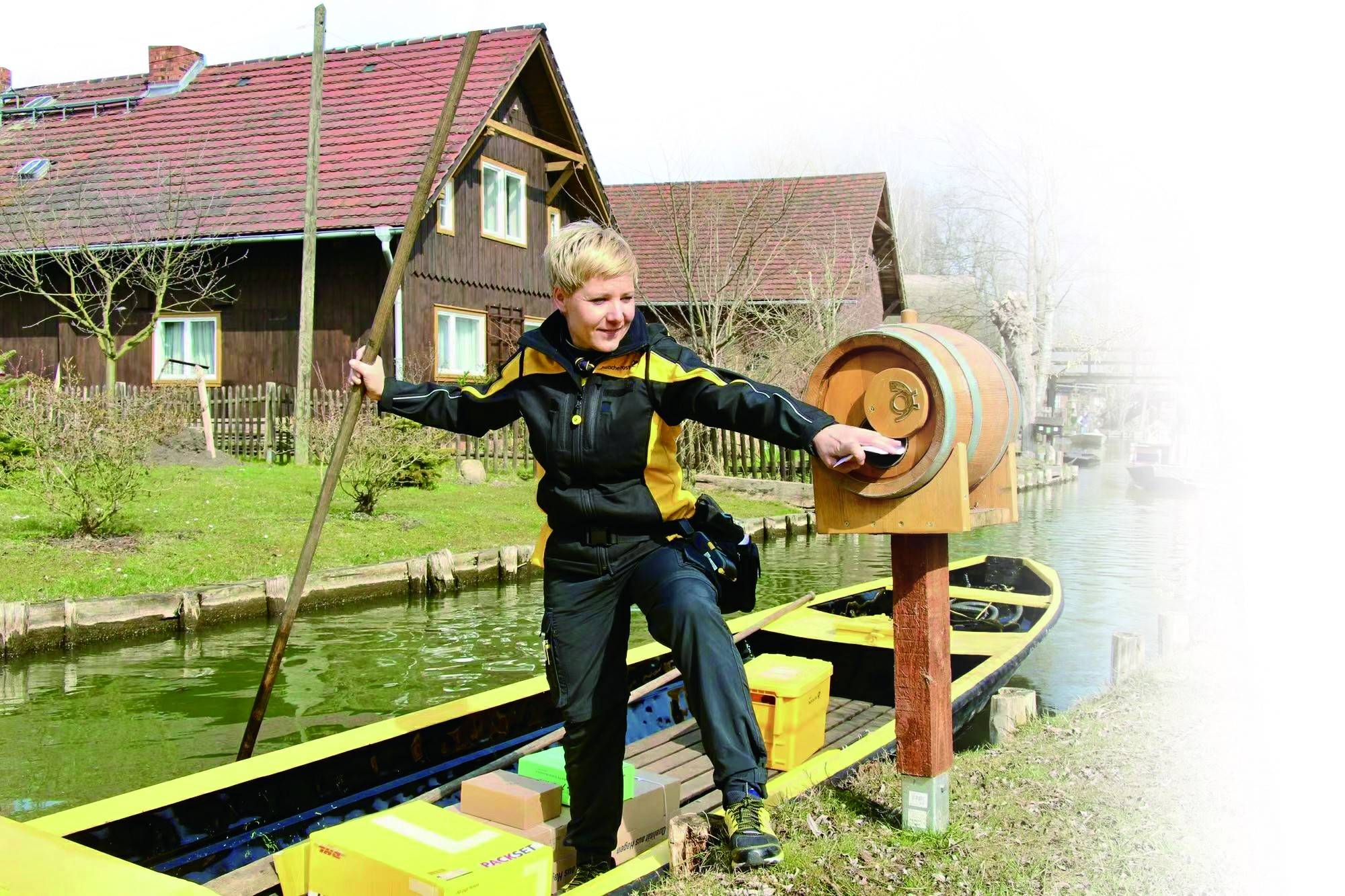 52岁的安德里亚就是施普雷森林唯一的水上邮递员。当地莱德村的许多家庭与道路没有直接联系,信件和包裹必须用船才能送达。这已经是她作为水上邮递员的第12个年头了。早上,她先骑着邮政自行车在吕伯瑙镇送信,中午时分,她登上黄色小船,拄着撑船杆,在莱德河给村里的住户送信送货。