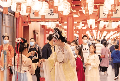 记者又来到长安十二时辰主题街区,未到景区门口,就见一波又一波的经营者向游客推荐唐装汉服体验。“最近,外地游客明显增多了。”一经营者说,“‘五一’的西安会更火。尤其长安十二时辰还推出了很多好玩的活动,慕名来的人就更多了。”记者随机采访了一位穿着汉服的姑娘,她笑着说,“来西安,就是想亲身体验一下穿越的感觉。”