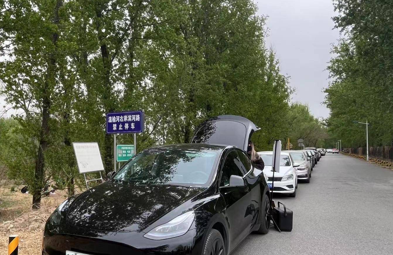 温榆河滨河路上竖立着多块提示牌。其中一块提示“温榆河右岸滨河路禁止停车”,另一块显示“河道管理范围内禁止从事露营、烧烤、放生、捕鱼……等活动,违者将依法惩处”。这些提示牌旁边,私家车一辆紧挨一辆。由于路侧是数米落差的陡坡,车辆无法开下河岸,来此游玩的市民大多把车停放在路边。1公里的滨河路上停放的私家车多达数百台。还有人专门把车停在路边做起生意,向前来露营的市民售卖饮品。