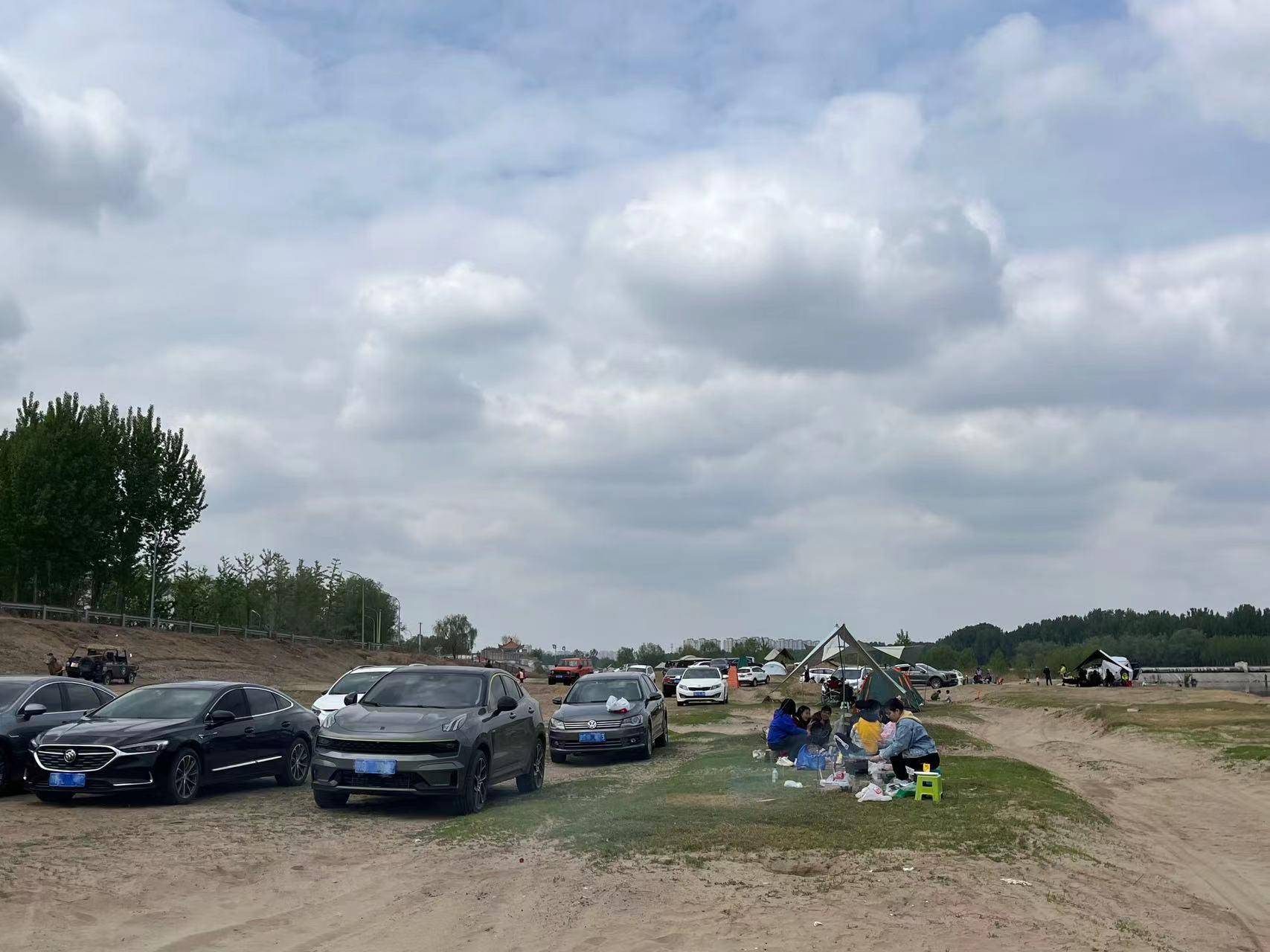 河床上是大片沙地,但靠近河水的地方已经长出嫩草。上午露营爱好者陆续抵达,多数顺着河岸的斜坡,直接把车开进河床,选好合适的位置后,就地停车搭建天幕、帐篷。多数车辆都停在刚萌芽的草地上,临近中午,人越来越多,绵延四五公里的河床上,私家车多达数百辆。