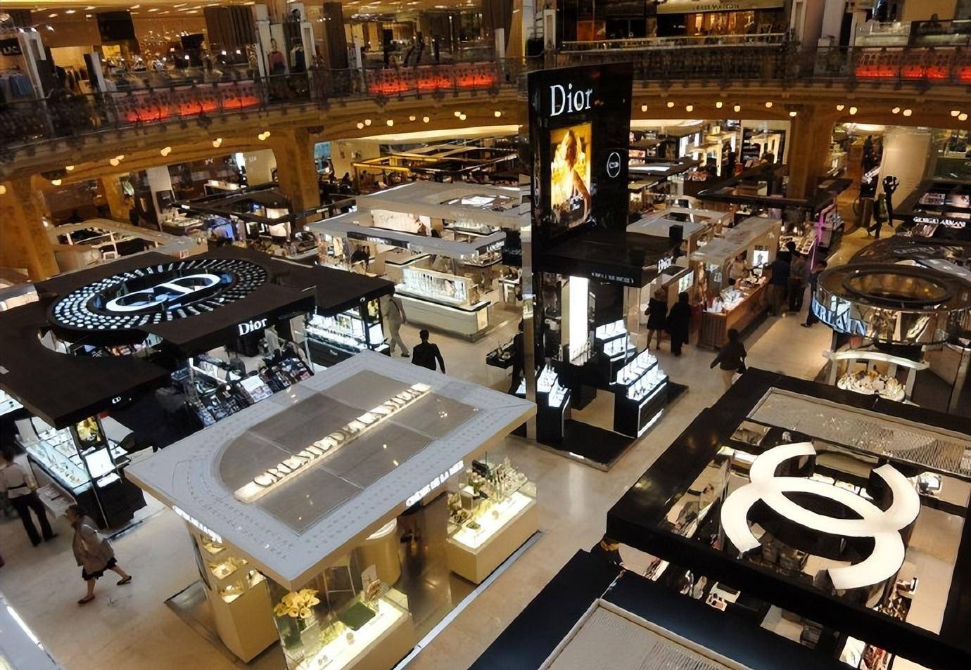 俯瞰老佛爷百货商场的中庭,能见到各种著名化妆品牌的巨大logo。