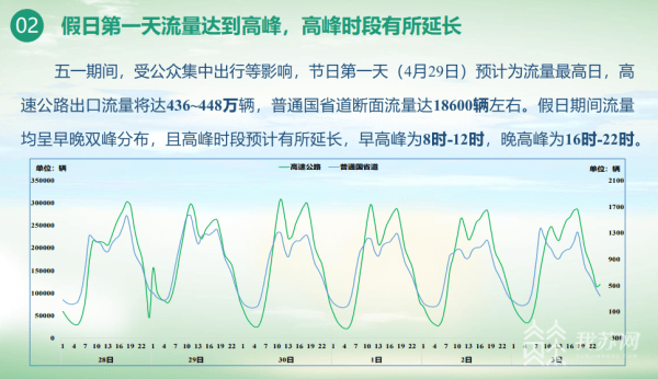 “五一”期间,全省普通国省道日均断面流量将达到16200辆左右,同比增长约98%,较2019年“五一”增长约18%。流量最高日预计出现在假期第一天,断面流量约为18600辆左右,较平日增长约40%。