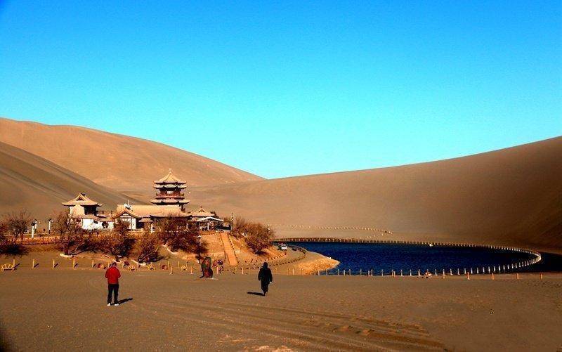黄沙环绕,有一月牙泉。千百年来未被流沙掩埋,也未被旱灾晒干。它一直与沙漠和谐相处。这是沙漠奇观,大自然的奇迹。