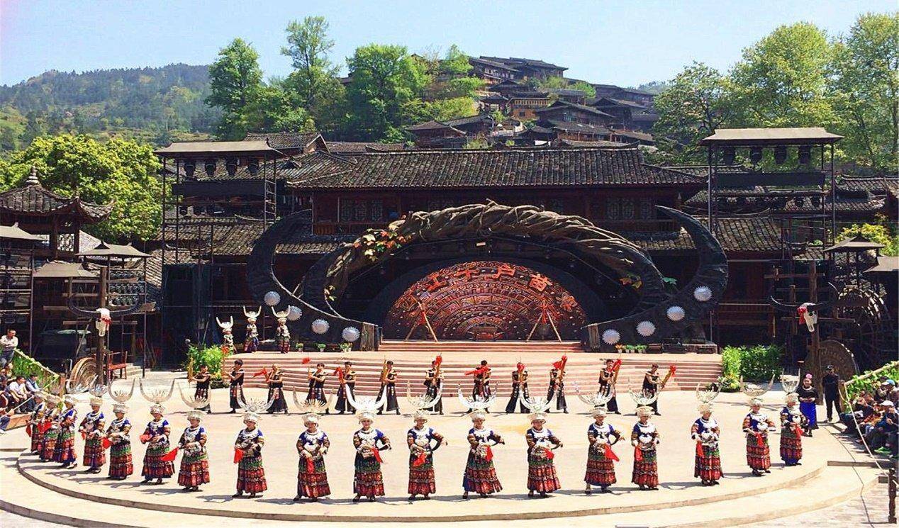 可以看到苗寨呈牛头状!苗族的歌舞表演久负盛名。每天早上和下午都有当地苗族表演的民族歌舞。