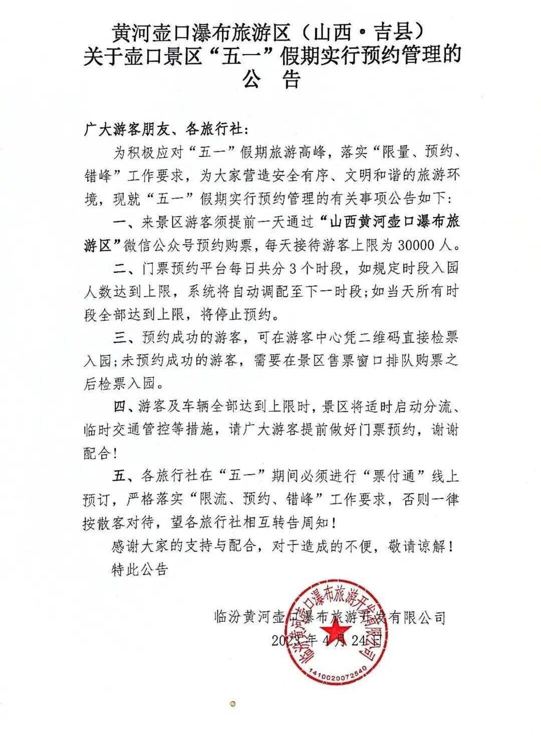 一、来景区游客须 提前一天通过“山西黄河壶口瀑布旅游区”微信公众号 预约购票,每天接待游客上限为 30000 人。