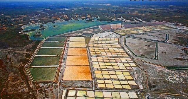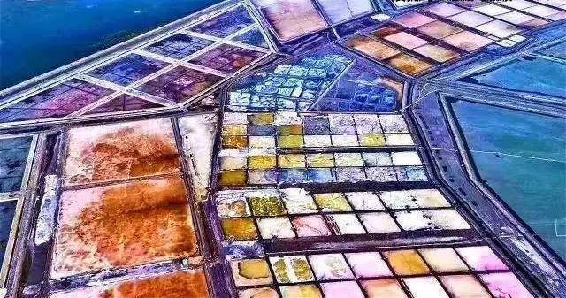 在强烈的阳光下,盐池中的藻类和矿物质会发生变化,使盐池色彩斑斓。每个盐池的颜色都不一样,有黄的、橙的、红的、粉的、白的……就像一盒女生眼影盘,排列整齐,方正。