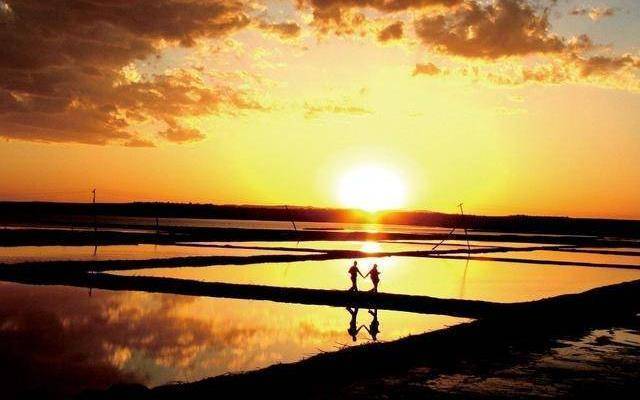傍晚,盐湖反射着太阳的光辉,又是另一番景象。不同于白天的梦幻,夜晚的盐湖更具诗意。