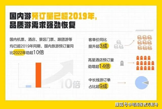 除此之外,飞猪发布的《2023年“五一”出游风向标》显示,平台上国内机票、酒店、景区门票、跟团游等均已超过2019年同期,累计预订量同比去年劲增超10倍,其中,中长线游订单占比高达9成以上,租车预订量同比去年增长超5倍。