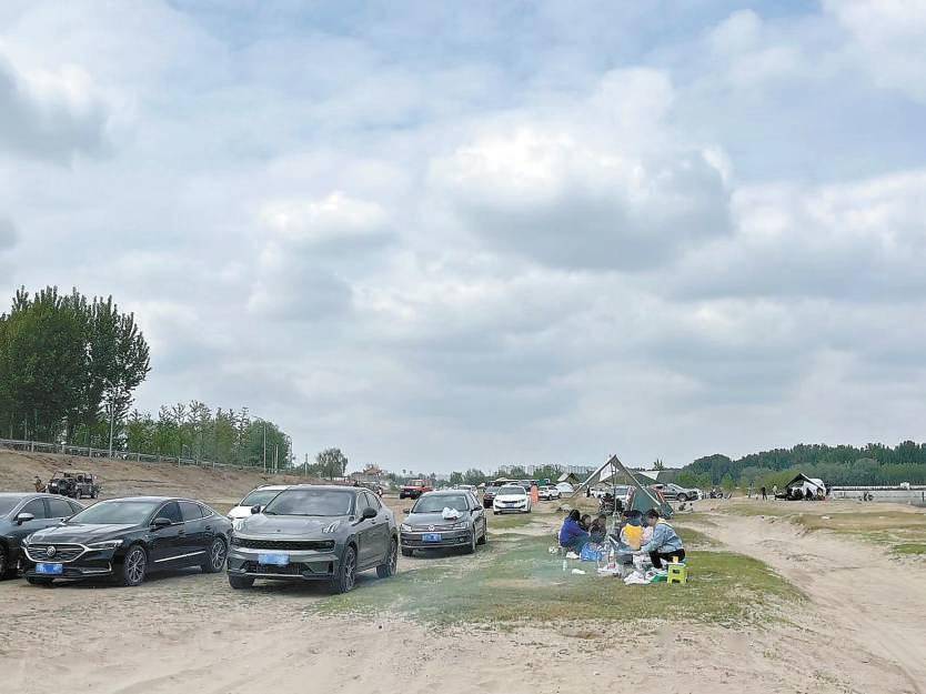 河床上是大片沙地,靠近河水的地方已经长出嫩草。上午,露营爱好者陆续抵达,很多人顺着河岸的斜坡,直接把车开进河床,选好合适的位置后,就地停车搭建天幕、帐篷。多数车辆都停在刚萌芽的草地上,临近中午,人越来越多,绵延四五公里的河床上,私家车多达数百辆。